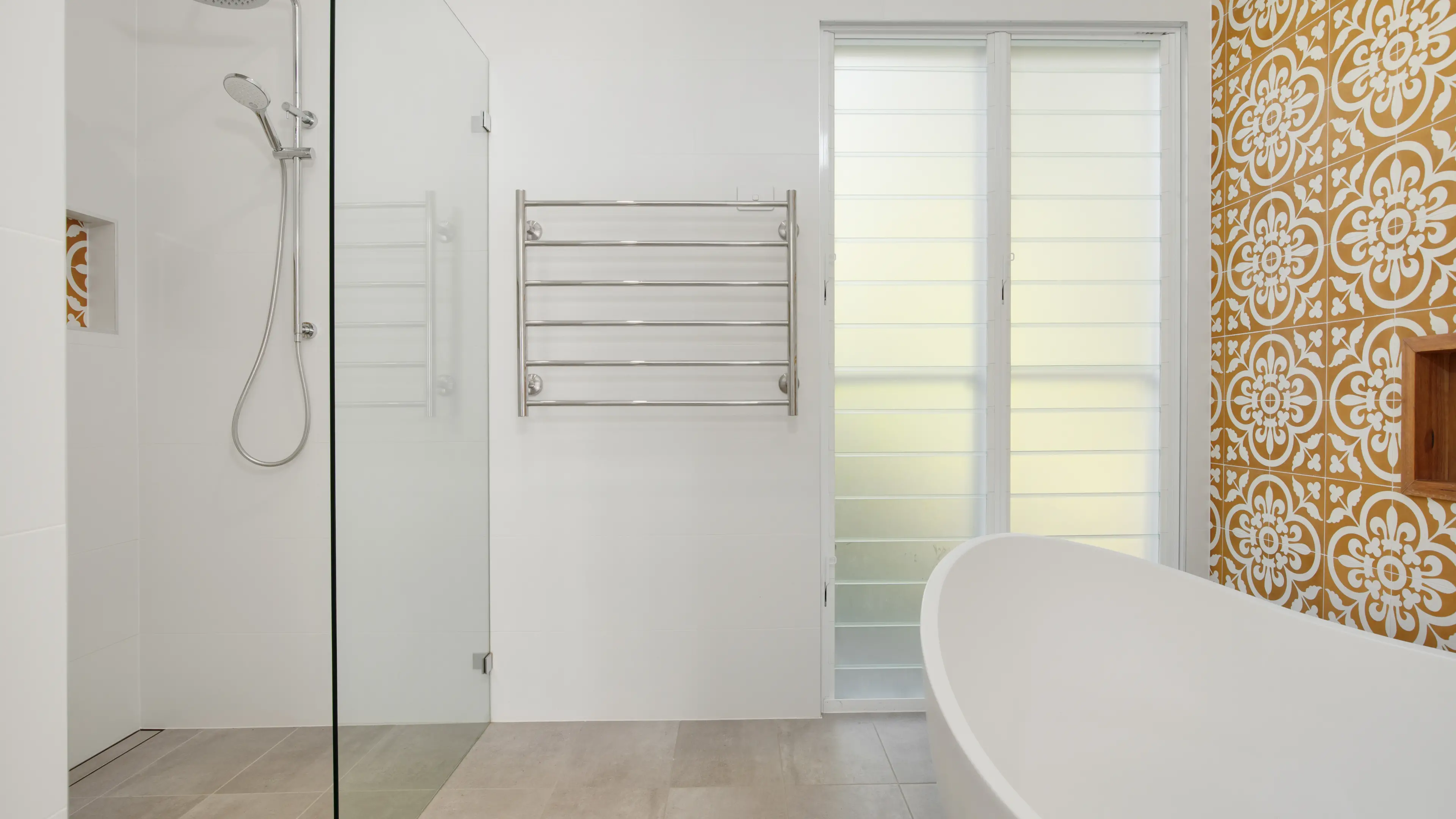 Solid herringbone flooring gives a timeless and elegant touch, while polished concrete in the open-plan living provides contrast, which is further highlighted and embraced through the use of varying finishing materials across tiling and cabinetry. Large windows, skylights and pitched ceilings create a grand sense of space that is open, yet homely.