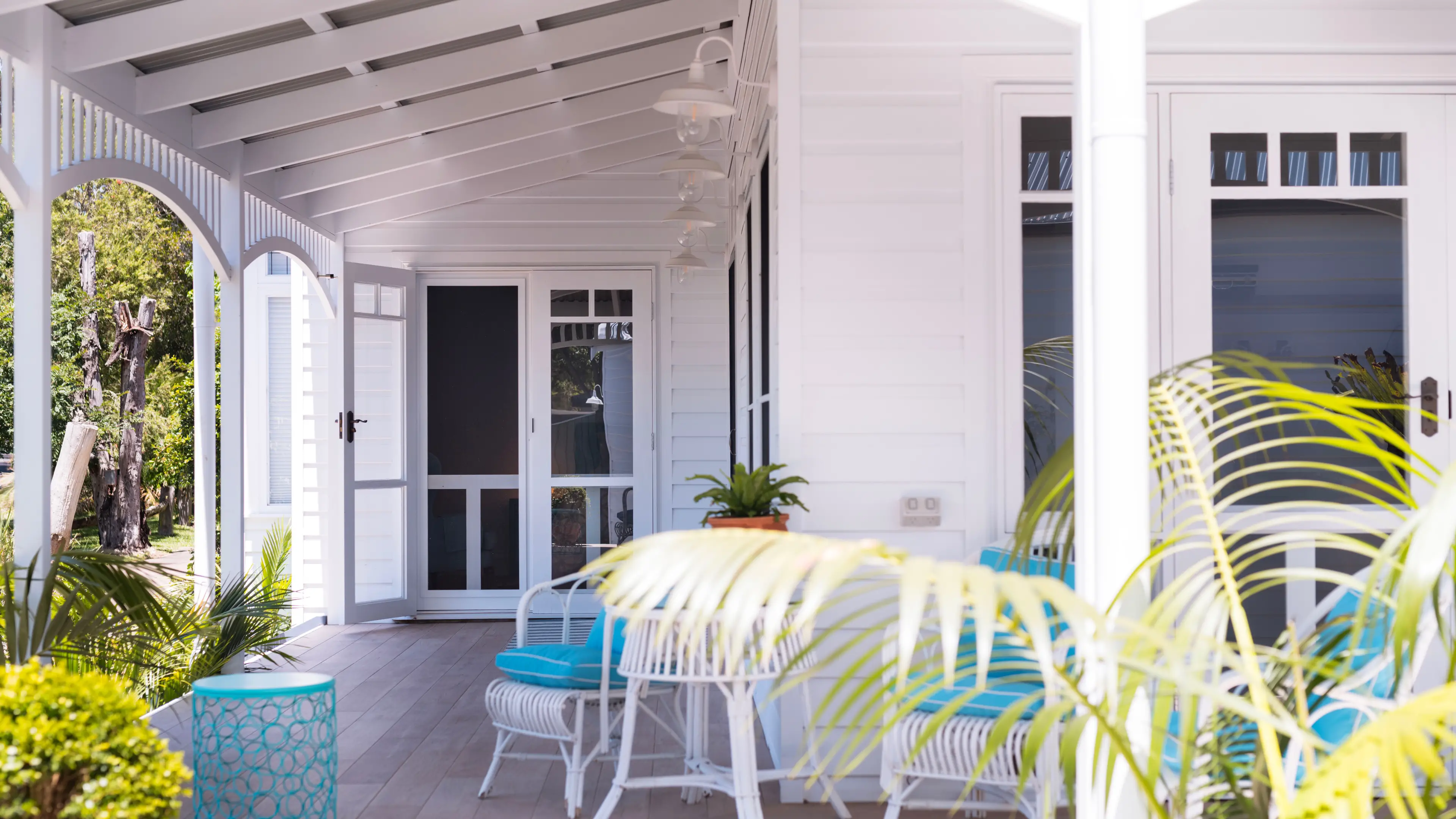The indoor-outdoor deck area features Weathertex federation cladding with V-groove timber panelling covering the ceiling and lobster pot pendant lights with a tropical ceiling fan. On the exterior, there is a stunning enclosed al fresco entertaining area with a huge deck, outdoor kitchen and pool.