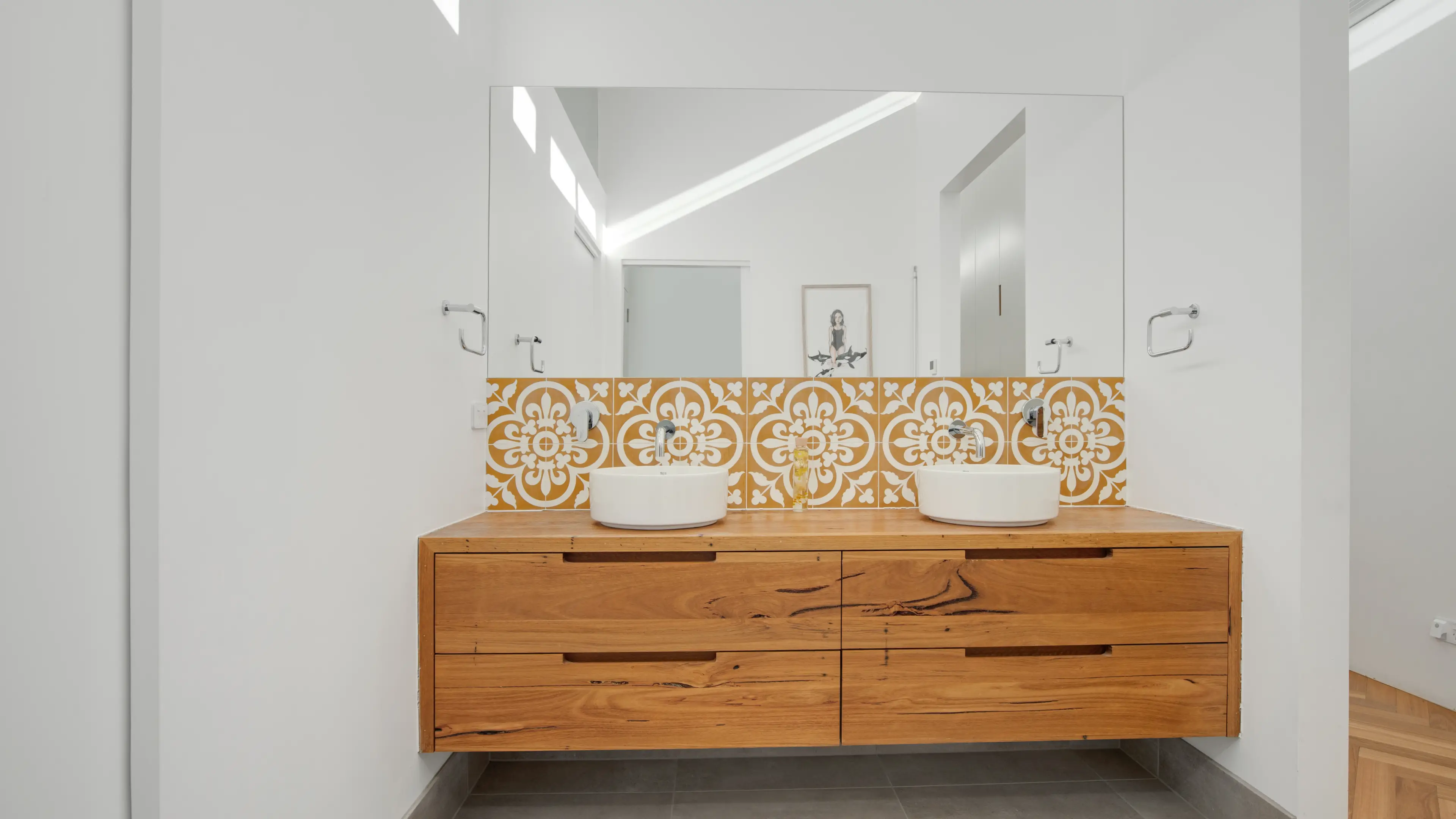Solid herringbone flooring gives a timeless and elegant touch, while polished concrete in the open-plan living provides contrast, which is further highlighted and embraced through the use of varying finishing materials across tiling and cabinetry. Large windows, skylights and pitched ceilings create a grand sense of space that is open, yet homely.