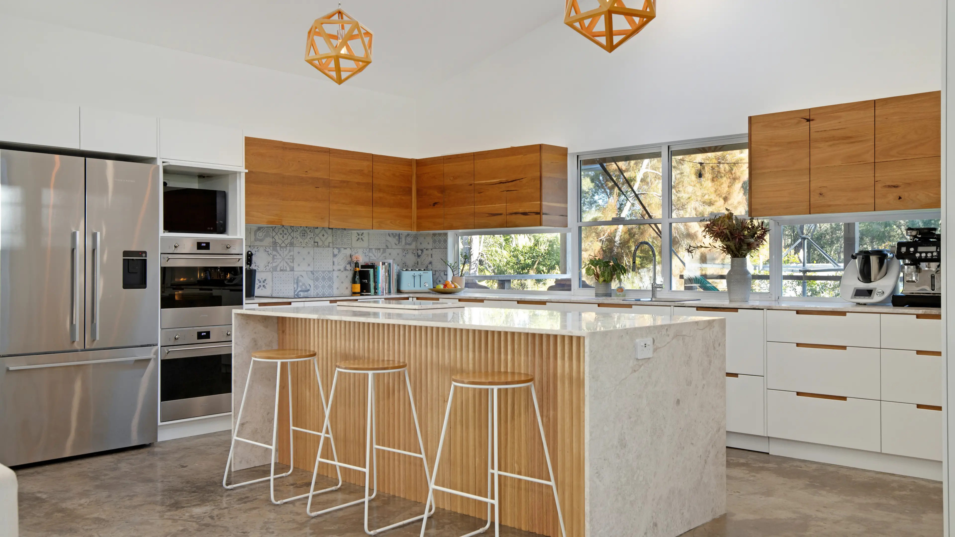 The result, an eco-conscious and highly architectural split-level home that calmly cascades with the environment, offering year-round comfort through hydronic in-slab heating and solar passive design for maximised energy efficiency.
